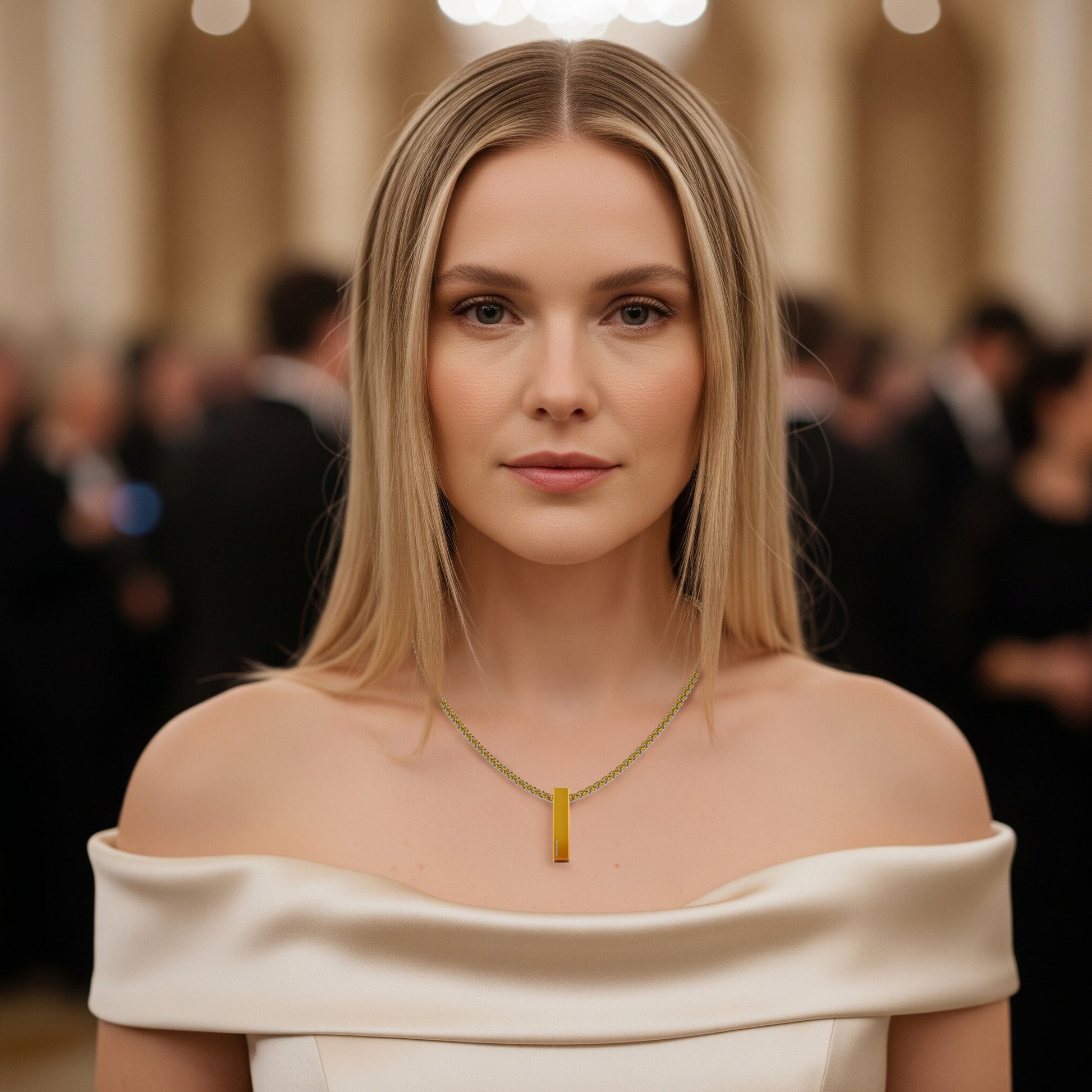 The Pure Monolith pendant is suspended from a unique and luxurious chain, crafted from both 24kt gold and platinum. The interplay of the intense yellow of pure gold and the cool, silvery sheen of platinum creates a visually captivating and texturally intriguing element, perfectly complementing the pendant's bold simplicity.